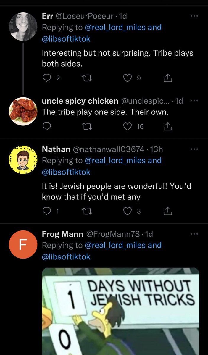 A sample of replies from Chaya Raichik’s followers as she uses Libs of TikTok to promote antisemitic, transphobic, racist conspiracy theories 🧵