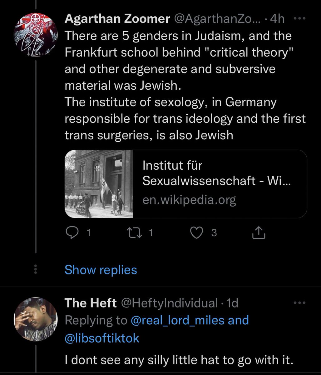 One response to LibsOfTikTok calls for the murder of anyone supporting trans rights in a thread blaming Jews. Chaya Raichik has the ability to hide this threat, speak against it or report it and has done nothing but continue 🧵