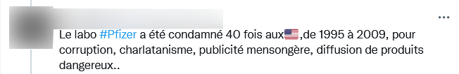 D'abord vérifier les faits. Oui Pfizer a été condamné à de multiples reprises. Mais 40 c'est le nombre de cas portés devant les tribunaux selon wikipedia et non de condamnation. Et Jamais pour charlatanisme.