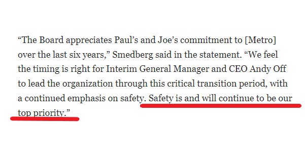 (3) These are Metro truths: safety is not the priority & hasn't been since even before trains began running 46 years ago (go back & look at DCFD Fire Marshal John Breen's 1970's battles with WMATA); everything trumps safety; Metro currently has neither safety or service. (more)