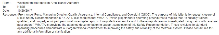 (8) When Carol Glover's train became trapped after being sent to find smoke in January 2015 @NTSB told Metro to stop sending passengers to look for smoke and fire. Metro complied ... sort of. (more)