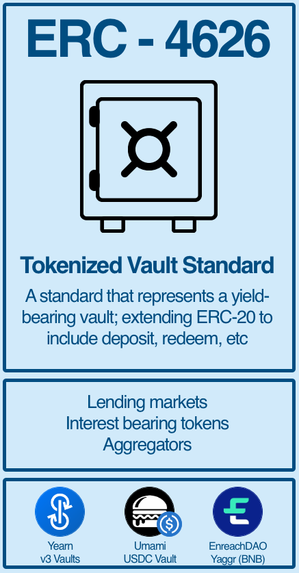 (10/15) ERC-4626 is the newest token standard, describing yield-bearing vaults. The standard provides a common interface for ERC-20 tokens deposited in (or redeemed from) a vault to earn yield. This can include yield farming and aggregation, but can be generalized to much more.