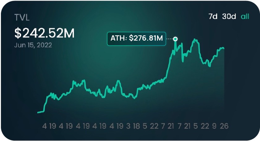 - TVL rocketed from $75M in early Jan to $277M in late Apr & remained at $200M+