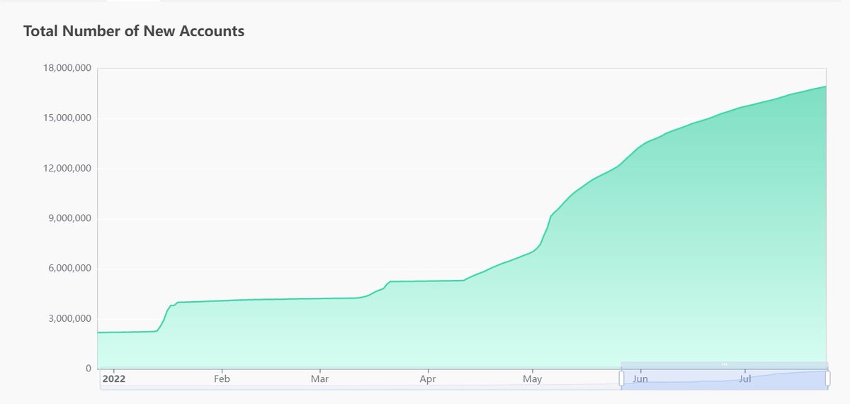 From on-chain indicators, we can see: The total number of #NEAR accounts has increased strongly by 612% in the first half of 2022. This shows the great demand of investors who want to participate in the Near ecosystem.