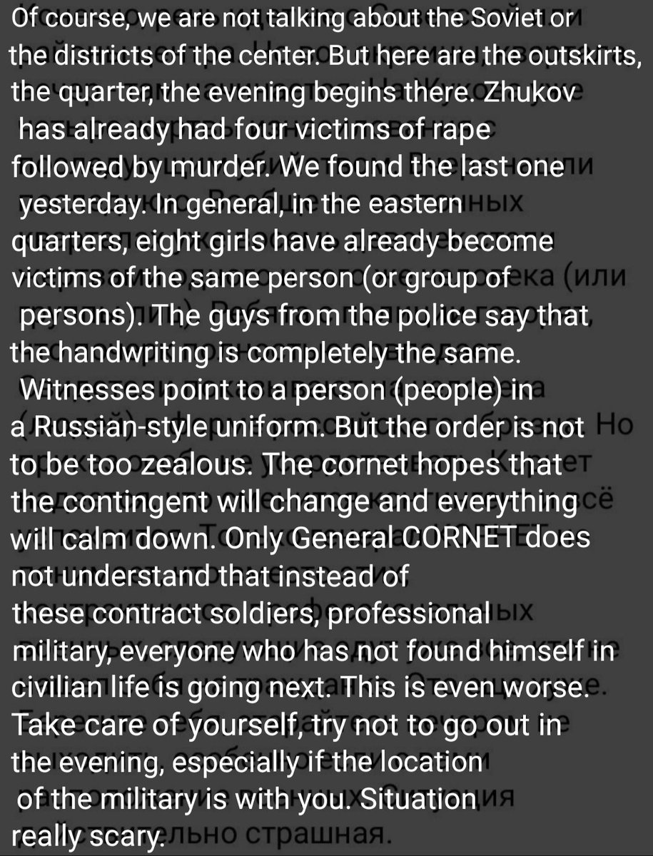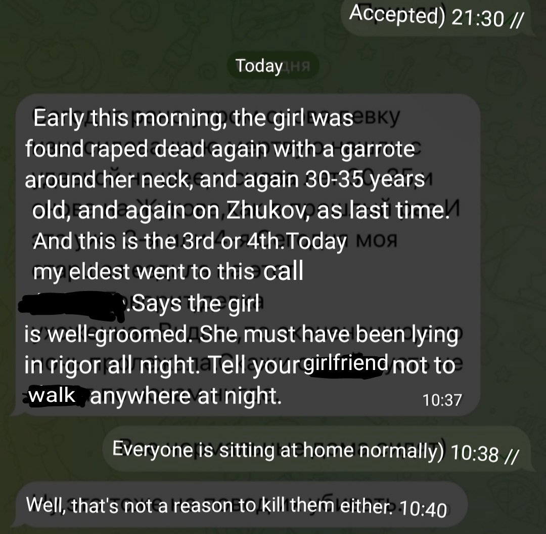 local residents say that this is already the 8th victim, several were found in the eastern quarters, and several in the Zhukov quarter, they were not recognized as killed, they were blamed either for alcohol or drug intoxication or for a heart attack, and so on.