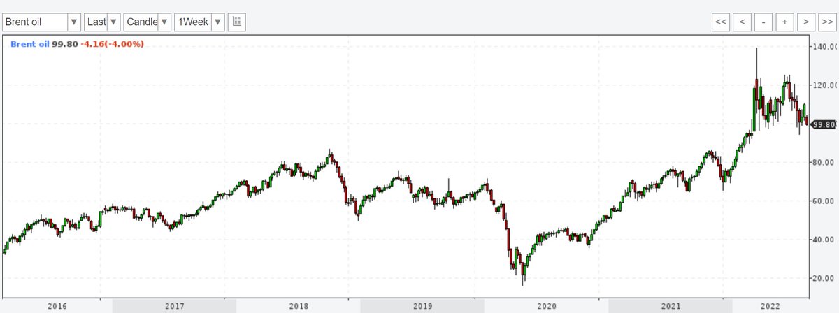 2.) Why is crude #oil expensive? Oil prices have been rising throughout 2021 as the world economy has been recovering from Covid-19: Demand increased and supply couldn't keep up. But: Prices are now at exactly at the same level as in February, before #Russia started its war. 4/