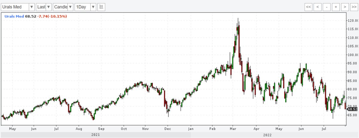 By the way, due to #sanctions, Russia has to sell its oil cheaper than other oil producers, so Moscow currently gets a lot less dollars for its barrels than before it started its invasion (in February more than $90, now $68 per barrel). 5/