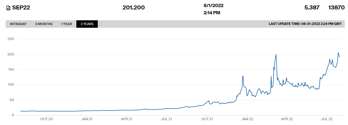 1.) Why is food expensive? E.g. wheat prices have been rising for a couple of years, partially due to Covid-related supply chain issues. When the war began, prices exploded for a few months, as Russia blocked Ukraine's exports, but right now wheat is cheaper than in late 2021. 2/
