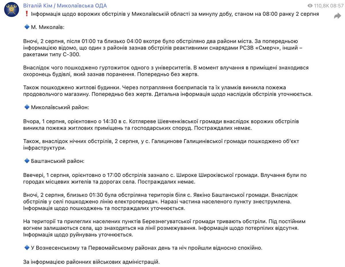 1/5 ⚡ [Russians] shelled two districts of the city, says Vitalii Kim, head of the Mykolaiv RMA.