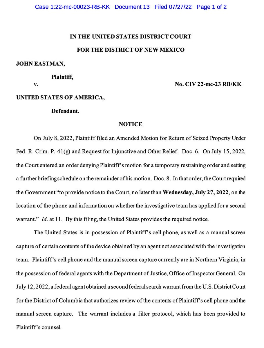 Just in: Federal agents say they obtained a second search warrant regarding John Eastman's seized cell phone two weeks ago. "The warrant includes a filter protocol, which has been provided to Plaintiff’s counsel."