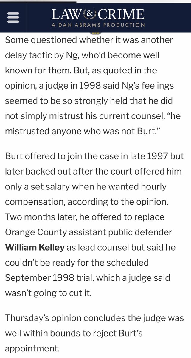 As my @LawCrimeNews article explains, Burt represented Ng in the Canada extradition proceedings and didn't work on the case. But Ng refused to work with his public defenders in Orange County years later, demanding Burt’s appointment. lawandcrime.com/crime/californ…