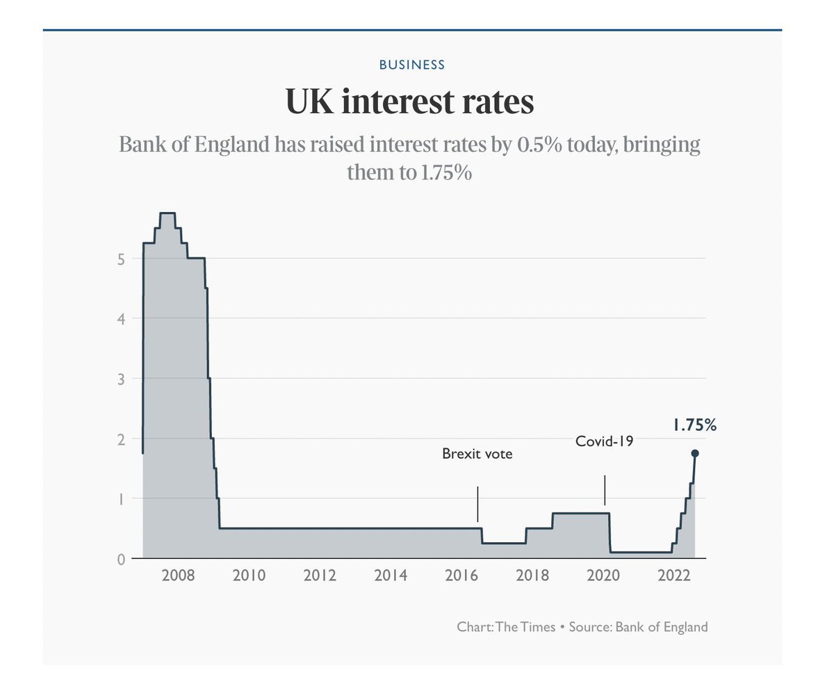 🔺 BREAKING: The Bank of England has raised the base interest rate by half a percentage point to 1.75 per cent, the biggest rise since 1995, in an attempt to combat runaway inflation thetimes.co.uk/article/intere…