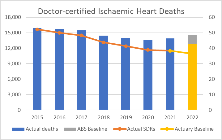 For heart disease, mortality improvement has been very high, resulting in a declining number of deaths each year. Here the ABS baseline looks too high.