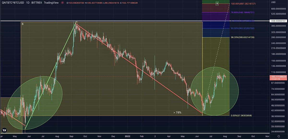 6/ Looking at this run off the June $37 lows compared to #QNT's rally last year (green circles), the similarities are clear. Will it do the same again, who knows, but if retail FOMO and institutional utility occur together, price action is likely to be something unprecedented