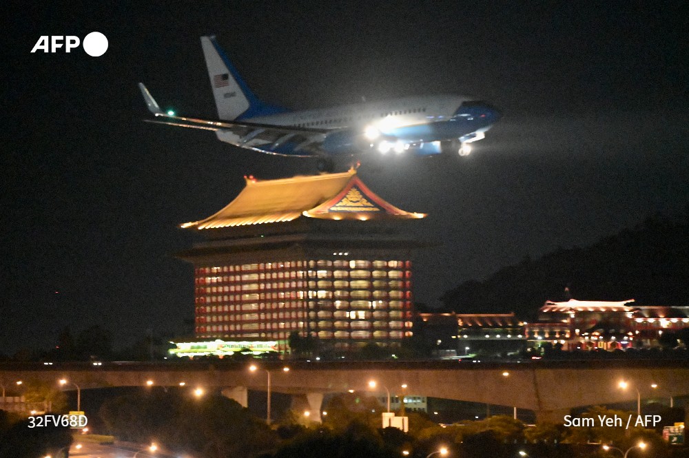 Des images diffusées en direct à la télévision ont montré Mme Pelosi, 82 ans, accueillie à son arrivée par Joseph Wu, le ministre taïwanais des Affaires étrangères. Elle est arrivée à l'aéroport de Songshan à bord d'un avion militaire américain #AFP