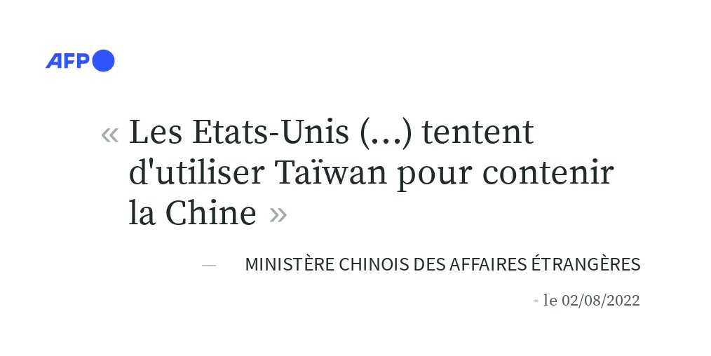 La Chine a dénoncé l'attitude "extrêmement dangereuse" des Etats-Unis, peu après l'arrivée de la présidente de la Chambre des représentants Nancy Pelosi à Taïwan, territoire que Pékin considère comme l'une de ses provinces #AFP
