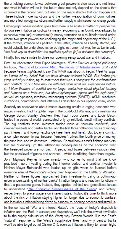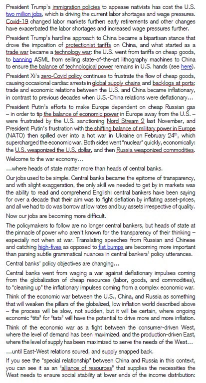 이제는 경제 전쟁으로 인해 좀 더 강하고 오래가는 인플레이션에 대해 생각 할 시기이며, 무질서한 리오프닝과 과도한 지원으로 인한 인플레이션은 덜 생각할 시기이다.