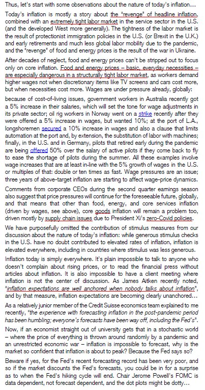 따라서 인플레이션이 조만간 피크에 다다를 것이라는 첫번째 가정은 틀렸고, 그러므로 호키시한 정책금리의 끝에 다가가고 있다는 두번째 가정도 틀렸다.
