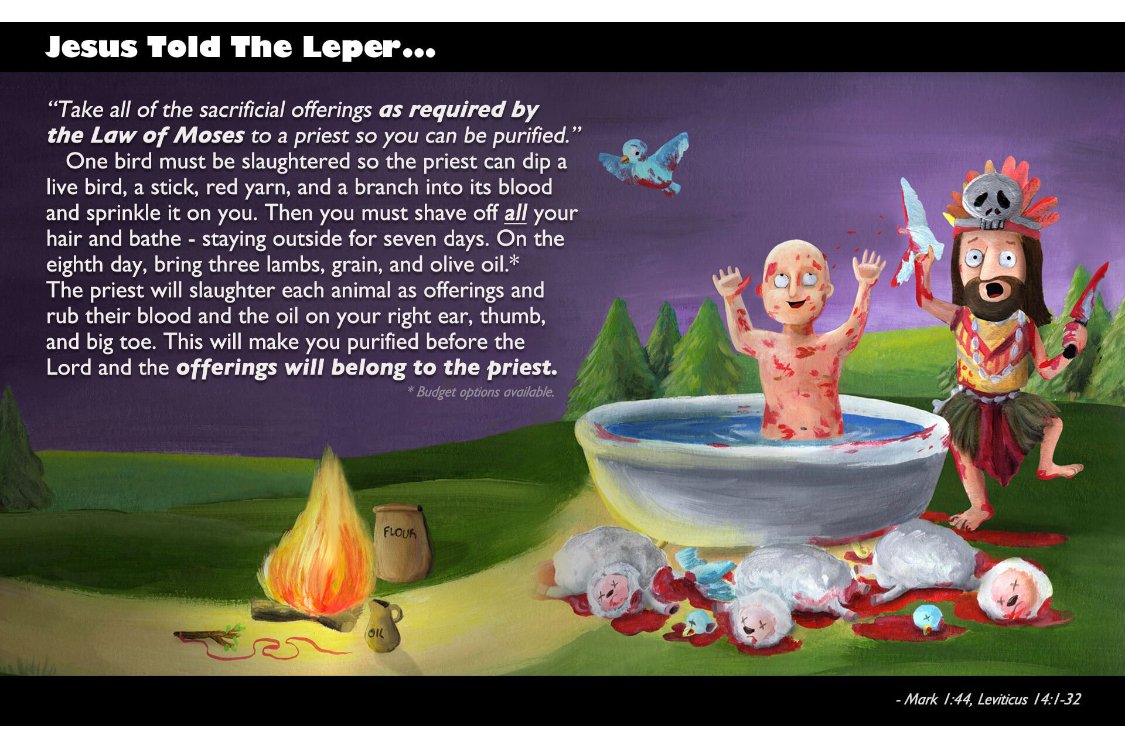 Jesus and his love for animals, whoever thought he was the messenger of peace, should read this verse; a leaper is asked to sacrifice three lambs and a bird.