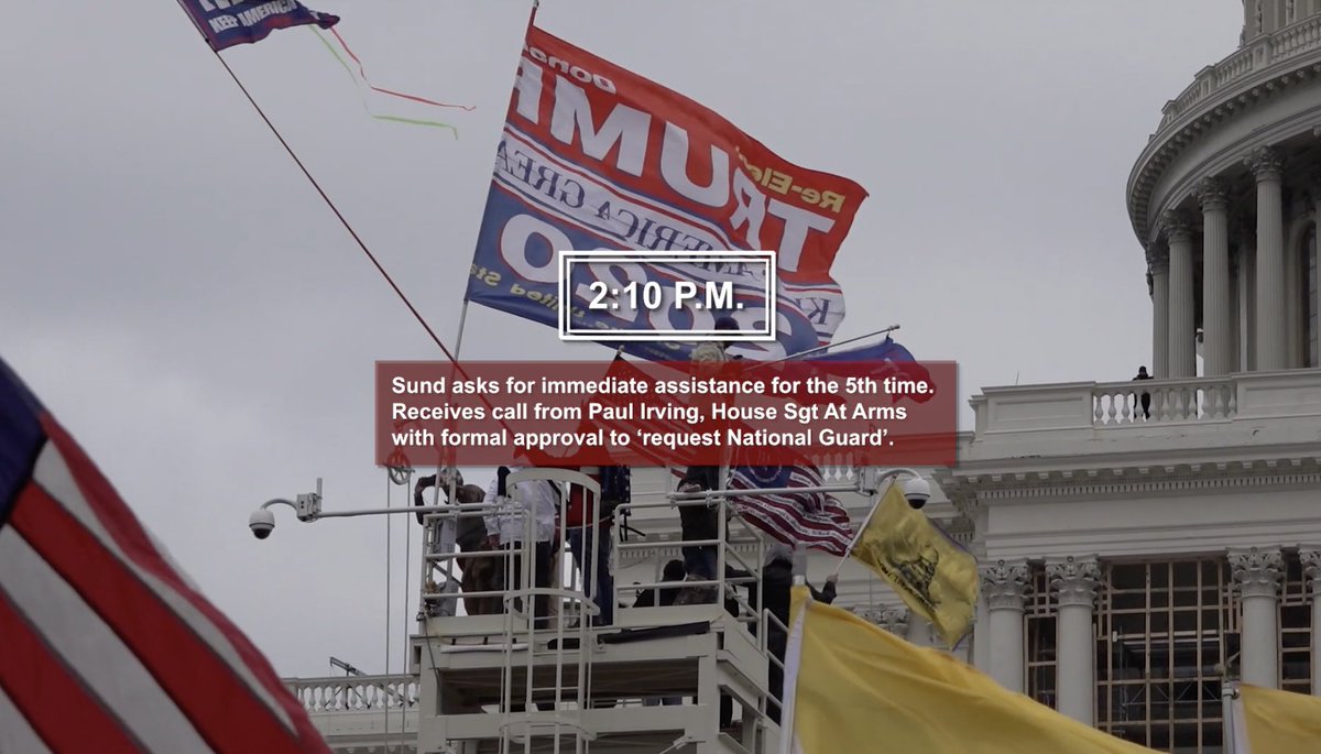 #5 2:10pm Capitol Police Chief Sund asks for immediate assistance for the 5th time. Receivers a call from Paul Irving, House Sgt At Arms with formal approval to 'request the National Guard'