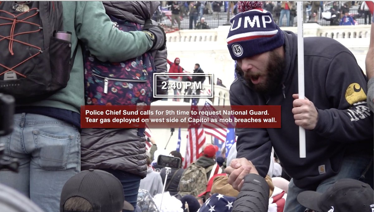#9 At 2:40pm Police Chief Sund calls for the 9th time to request National Guard. Tear gas is deployed on the west side of the Capitol as the mob breaches the wall by the scaffolding where the inauguration is to take place.