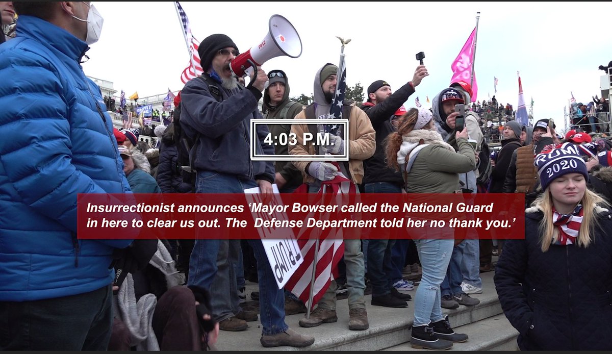 #12 (A) At 4:03pm Insurrectionist announces 'Mayor Bowser called the National Guard in here to clear us out. The Defense Department told her no thank you'.