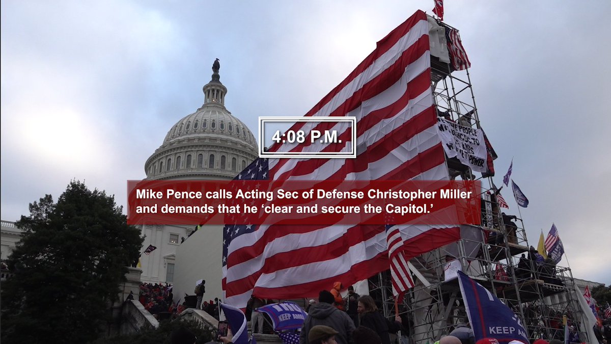 #12 (B) At 4:08pm Mike Pence calls Acting Sec of Defense Christopher Miller and demands he 'clear and secure the Capitol'