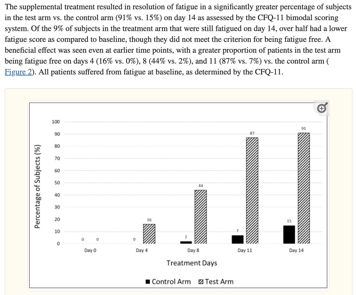 Authors concluded the supplements "significantly reduces the burden of both physical & mental fatigue [in early covid recovery]...many of whom continue to experience severe fatigue including muscle weakness and “brain fog” several months after initial infection."