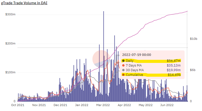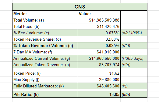 $GNS is a trading platform, and naturally revenues are derived from trade volume. As of today, gTrade has fulfilled ~$14.5B volume with recent daily volume upwards of $60M.