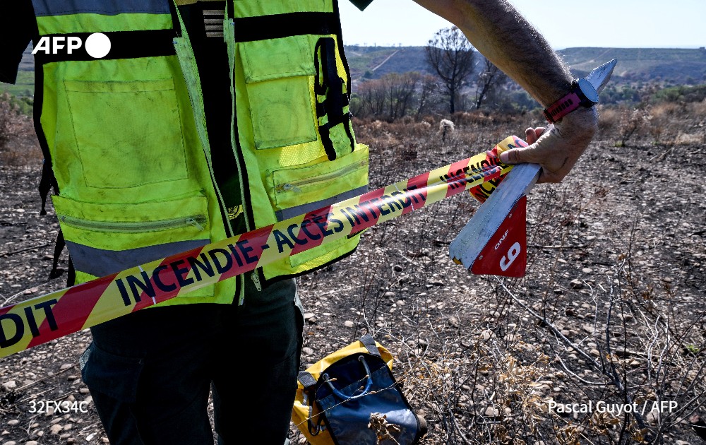 A Générac, dans le Gard, les agents de la cellule départementale de Recherche des causes et circonstances des incendies de forêt (RCCI), gilet fluo sur le dos, entouraient mercredi une zone calcinée de ruban rouge et jaune #AFP 2/4