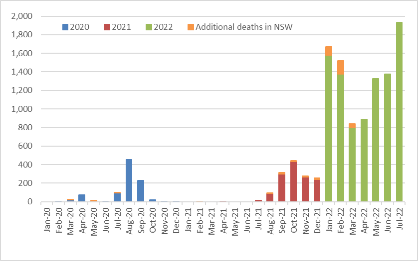 Combining our detailed excess death estimates to 30 April with our preliminary estimate of excess deaths due to COVID-19 only for May-July 2022, our conservative estimate is that Australia had experienced around 9,200 excess deaths across the pandemic by the end of July 2022.