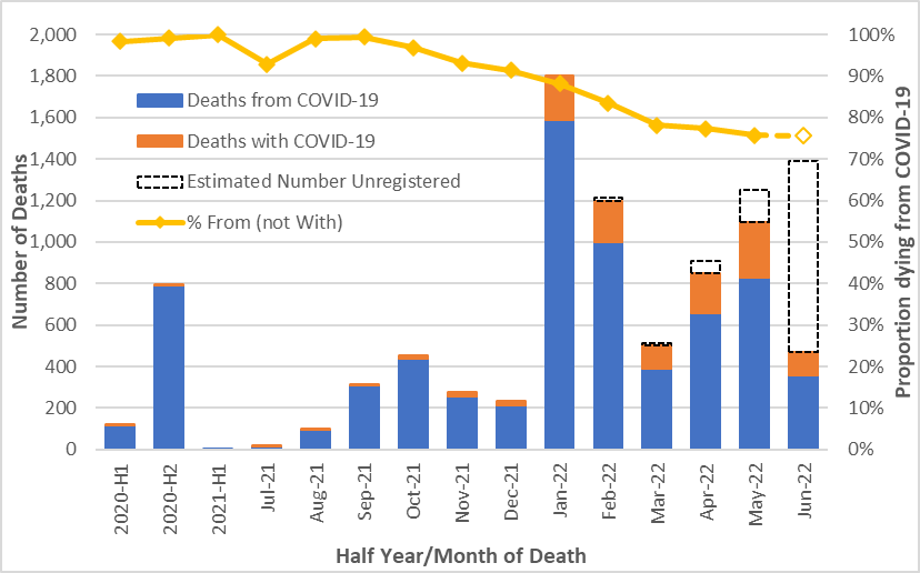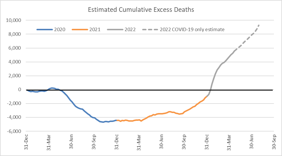 Thus we estimate that COVID-19 deaths alone will result in excess mortality of around 8% (+3,500) for the months of May-July 2022, with overall excess mortality likely to be higher than this.