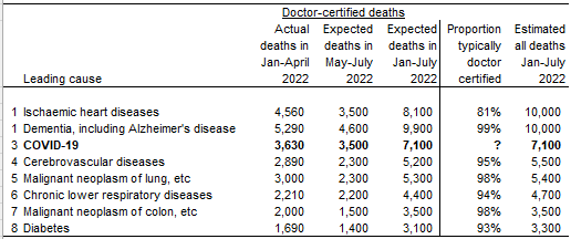 Deaths from COVID-19 are expected to reach 7,100 for the first 7 months of 2022 (3,600 doctor-certified deaths Jan-April plus 3,500 deaths May-July).
