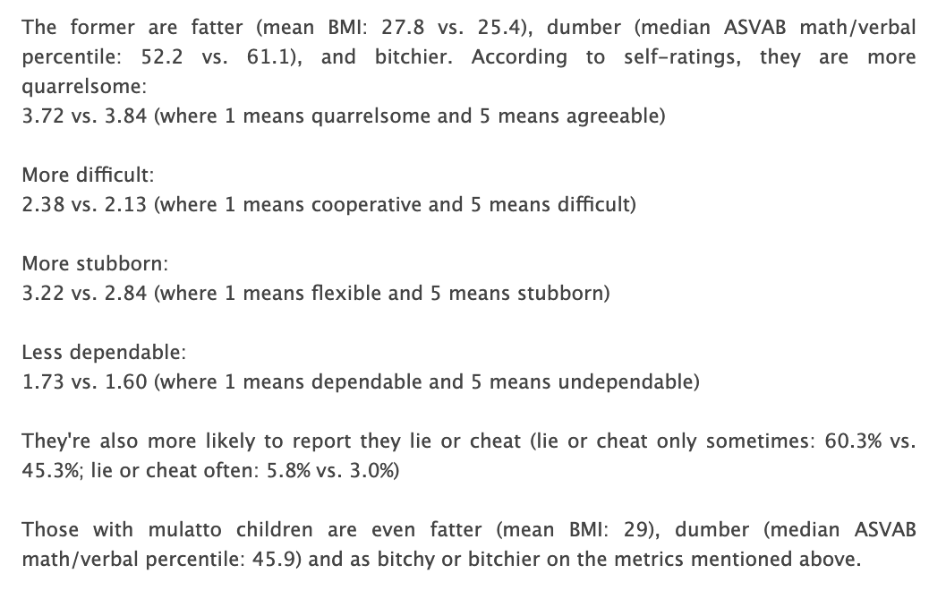 Interesting old blogpost which looks at NLSY data and claims that white women who have had black sexual partners are dumber, uglier, fatter, less educated, more stubborn and less blonde/red haired then white women with only white sexual partners... racehist.blogspot.com/2009/04/more-d…
