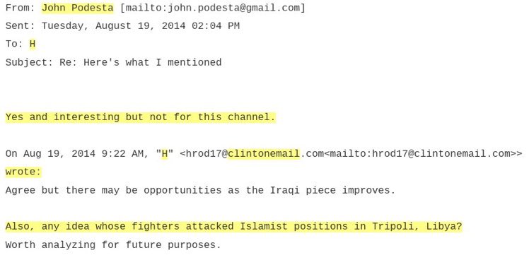 Hillary Clinton (who was out of the government at this time) asked John Podesta (who was in the government) to disclose Libya attack intelligence over email, and this was of zero interest to the Justice Department.