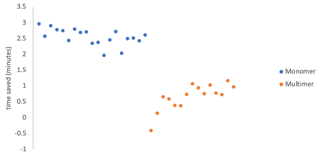 Rough runtime differences on mono/multi-mer predictions (on the cluster, with other jobs running) from @milot_mirdita . For a mulit-hour run (large proteins or batch-mode that avoids recompiling between preds), a few mins saved isn't much, but for interactive colab use, it is! 😅