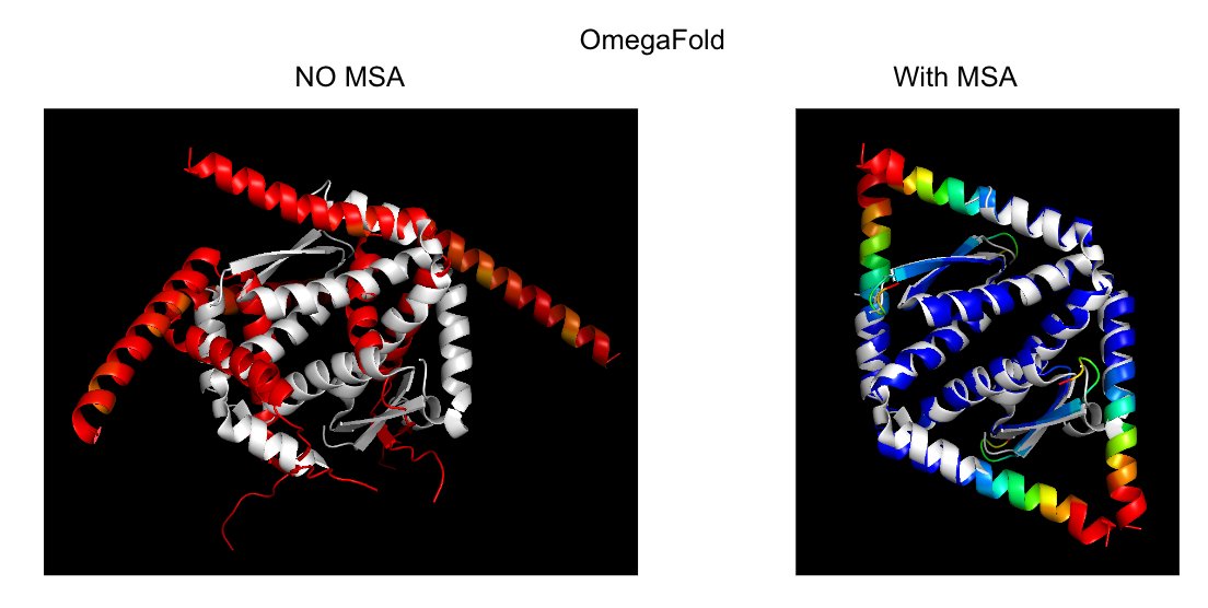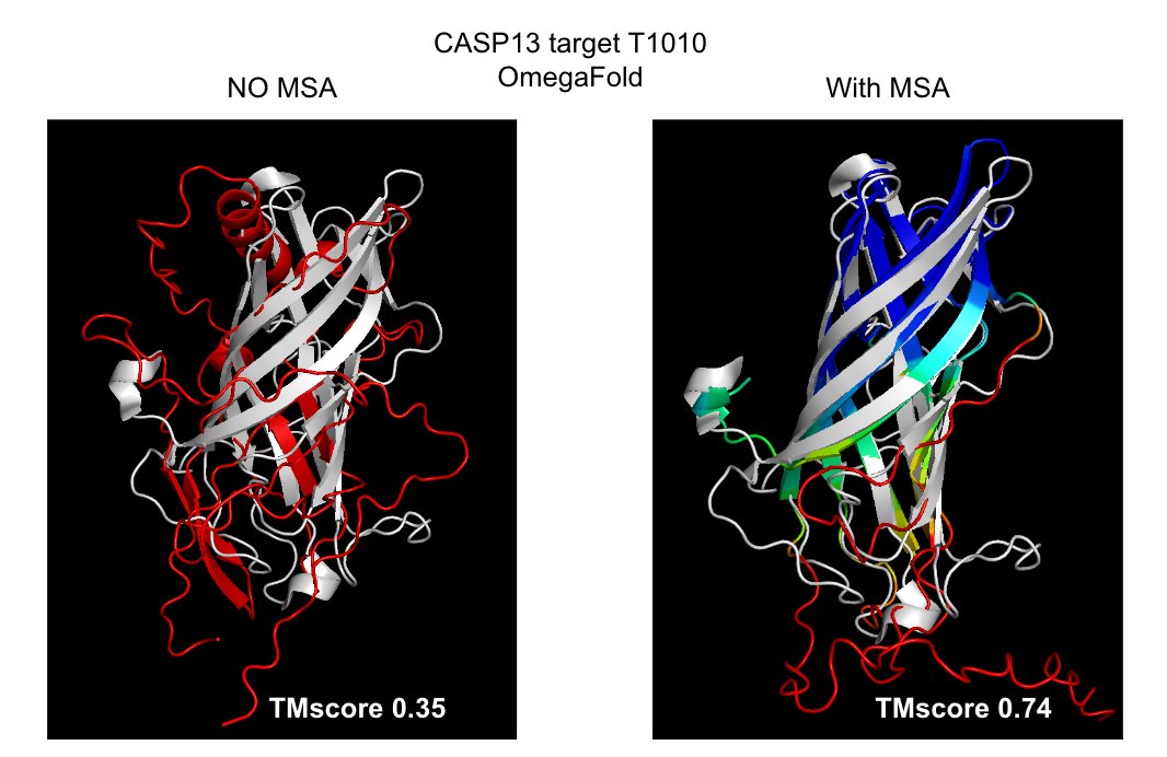 Found an example from @Alexis_Verger that OmegaFold fails on (and has low confidence). But if you hack OmegaFold to use an MSA input, it gets it right (and has high confidence)!