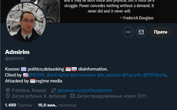 How does @admirim, Kosovo Albanian activist, systematically engages in misinformation, Holocaust distortion and guides the chauvinistic anti-Serb myths for the benefits of his political/ideological agenda?