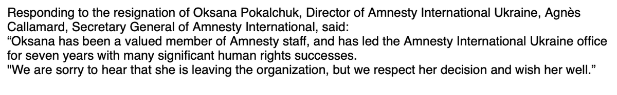 An Amnesty spokesperson confirms Pokalchuk's resignation and @amnesty's @AgnesCallamard in a statement to me: “Oksana has been a valued member of Amnesty staff...We are sorry to hear that she is leaving the organization, but we respect her decision and wish her well."