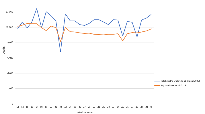 Latest UK excess deaths data to week 41 2022. This table & chart cover the period from 1 Apr to 14 Oct (Q2 to latest). I calculate the 5yr average using raw 2015-19 data.