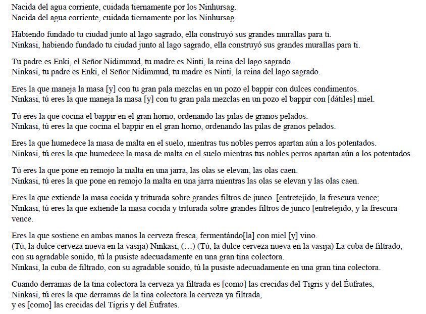 Ninkasi, tú eres la que extiende la masa cocida y triturada sobre grandes filtros de junco entre tejido y la frescura vence.