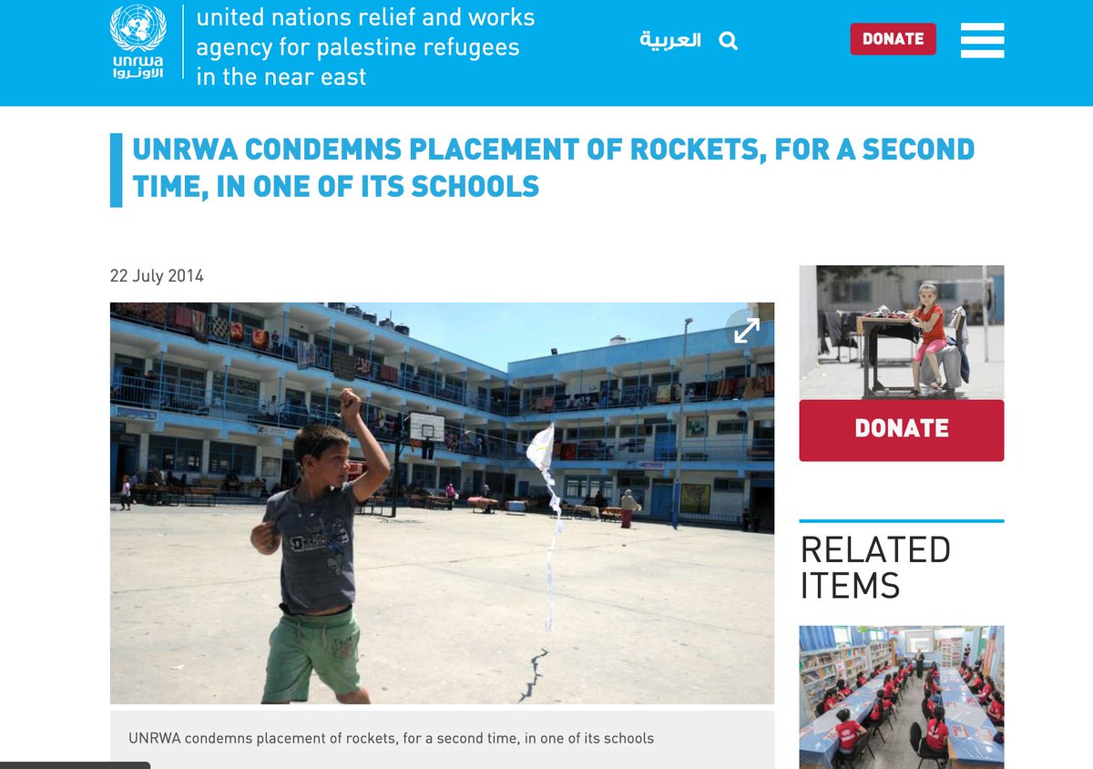 July 17, 2014: “Yesterday, UNRWA discovered 20 rockets hidden in a vacant school. UNRWA strongly condemns the group or groups responsible for placing weapons in one of its installations.” unrwa.org/newsroom/press…