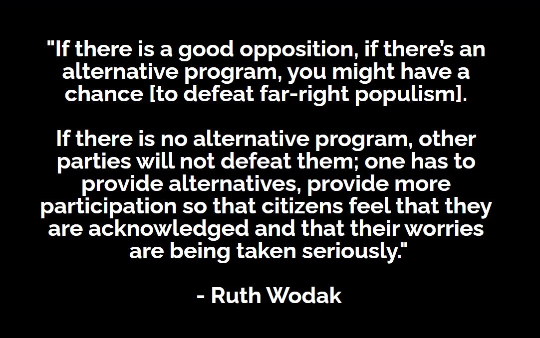 Ruth Wodak has spent her life studying the rise of post-war neofascism: the best (& possibly only) way to prevent it is through the ballot box. But to achieve this, people need a clear alternative to vote for, which is currently not on offer in Britain.