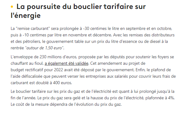 En France, je ne vois pas un parti à l'Assemblée qui n'ait saisi l'urgence climatique : La Nupes propose de bloquer le prix des carburants (mesure en plus d'être mauvaise pour le climat est indiscriminé donc socialement inefficace), LREM met un bouclier tarifaire sur le gaz (au