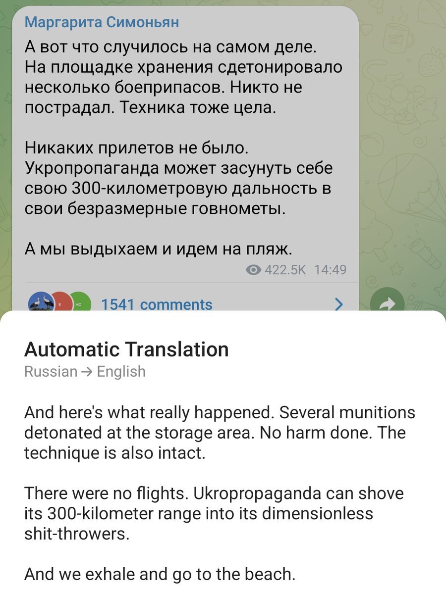 when asked if Ukr did it : "Of course not. What are we here for? These are probably compensatory mechanisms of inefficient management within the armed forces of the Russian Federation."