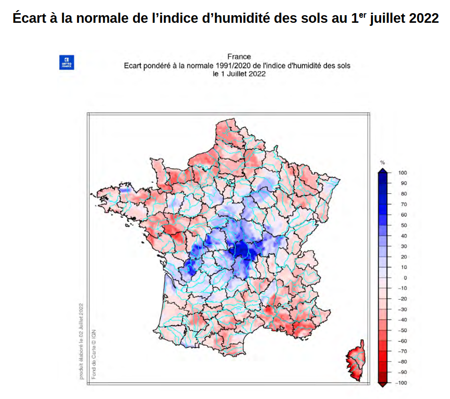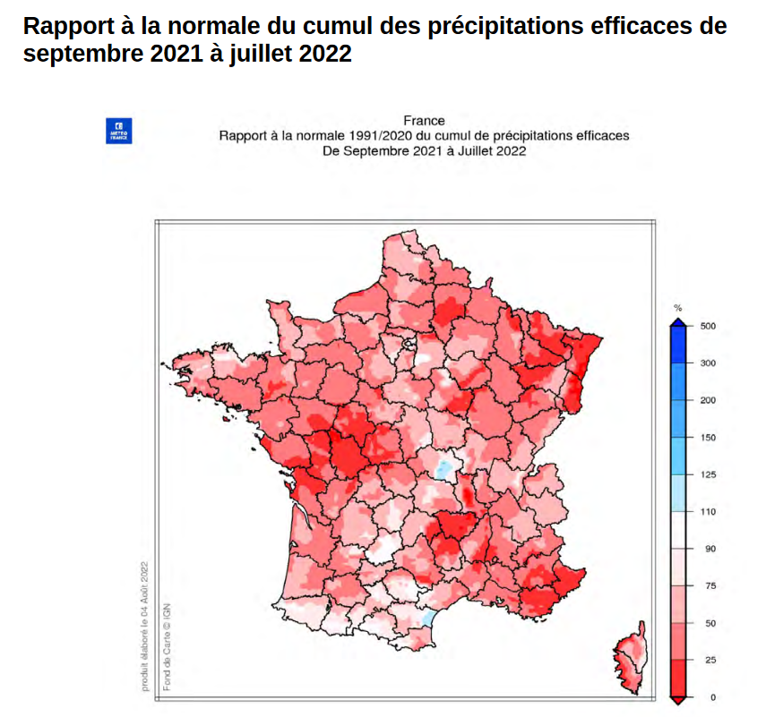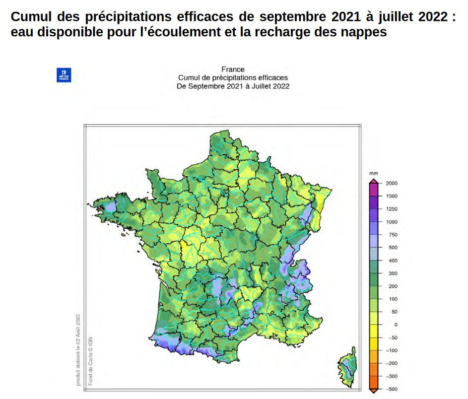 De septembre 2021 à juillet 2022, les cumuls de pluies "efficaces" (c'est-à-dire disponibles pour l’écoulement et la recharge des nappes souterraines) sont les plus faibles dans l'est, au centre-ouest et en Provence.