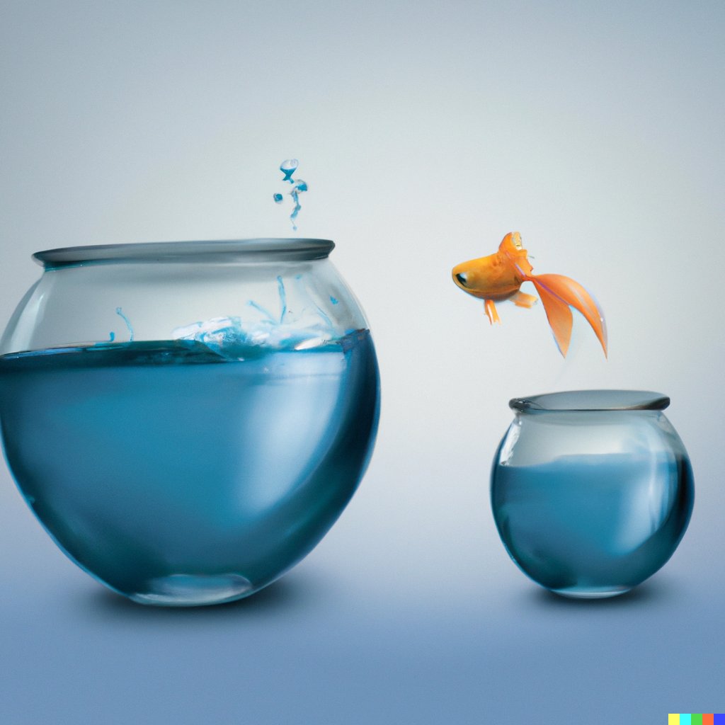 I wanted something cute, so I asked DALLE for “a fish jumping from a small fishbowl to a large fishbowl.”