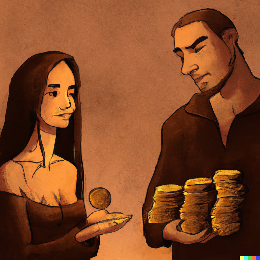 There are two remarkable things from this last illustration. First, I never specified that the woman should be holding anything, but AI decided to give her a single coin to emphasize that she was poorer. And I didn't ask that the man should be looking down on the woman.