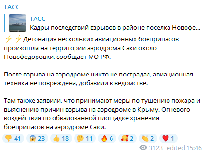 "The detonation of several aviation munitions occurred on the territory of the Saki airfield near Novofedorivka. After the explosion at the airfield, no one was injured, aviation equipment was not damaged."