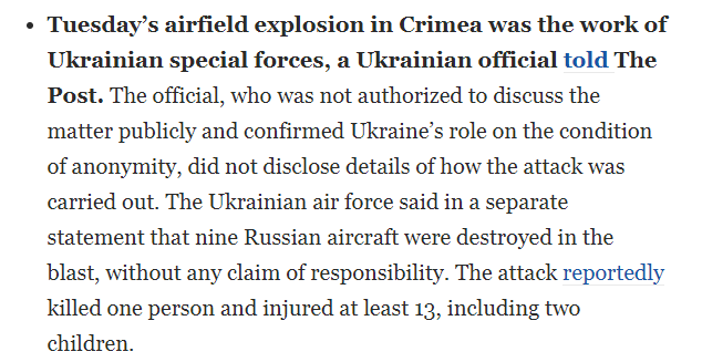 Potentially a huge revelation: a Ukrainian official, speaking on the condition of anonymity, told Washington Post that yesterday's attack on Russian air base in Novofedorivka was carried out by the Ukrainian special forces.